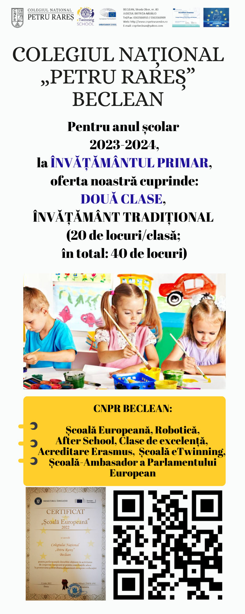 19/04/2023 Anunț concurs post muncitor 1-M 13/04/2023 Informații cu privire la înscrierea în CLASA PREGĂTITOARE, an școlar 2023-2024 13/04/2023 Oferta școlară pentru învățământul primar - CLASA PREGĂTITOARE, an școlar 2023-2024 04/04/2023 Comisiile C.J.R.A.E. Bistrița-Năsăud pentru evaluarea dezvoltării copiilor în vederea înscrierii în învățământul primar, an școlar 2022-2023 30/03/2023 Anunț concurs - ingrijitor I M, post vacant temporar, pe perioadă determinată 23/03/2023 Amânarea înscrierii în clasa pregătitoare 2023: Acte necesare și lista cu afecțiunile care pot constitui cauze de amânare 26/03/2023 Simularea examenului de Bacalaureat 2023